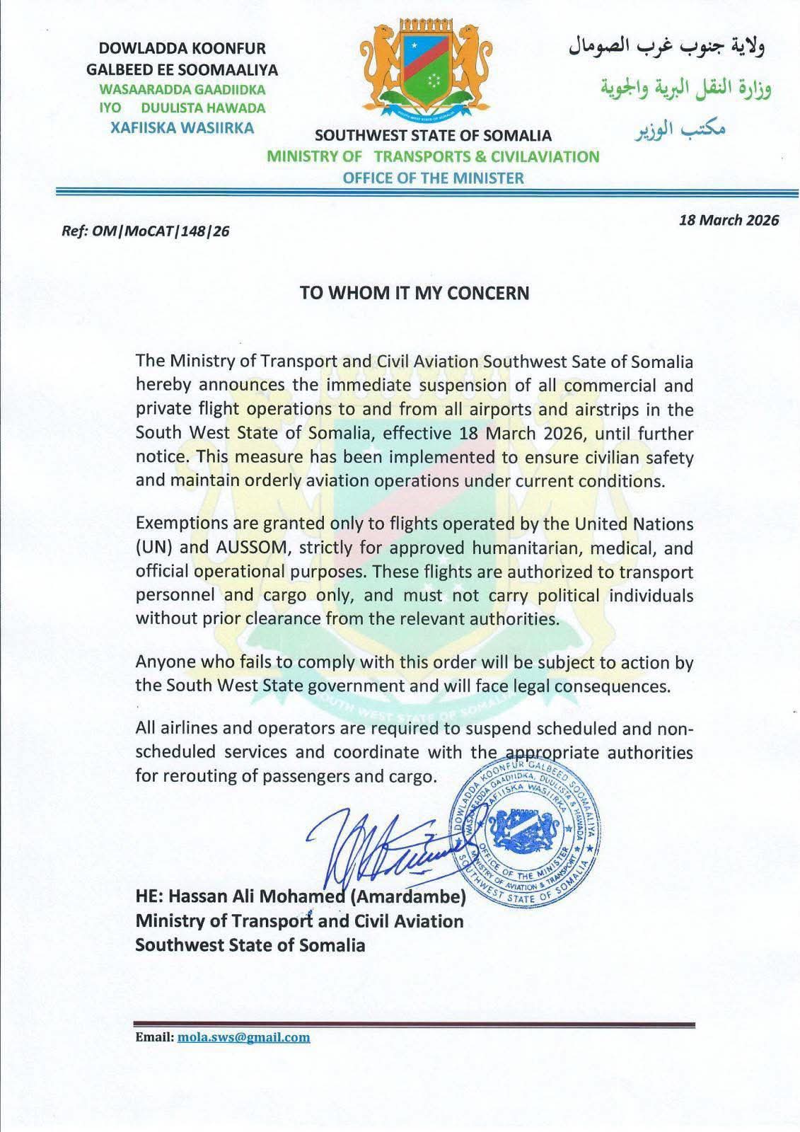 Kadib markii ay soo baxren warar sheegaya in maalinta bari ah uu Gudoomiyaha golaha shacabku ku beeganyahay magaalada Baudhabo ayay maamulka koonfur galbeed soo tuureen waraaq joojinaysa guud ahaanba diyaaradaha dul mara hawada maamulka koonfur galbeed ee Ganacsiga ah.